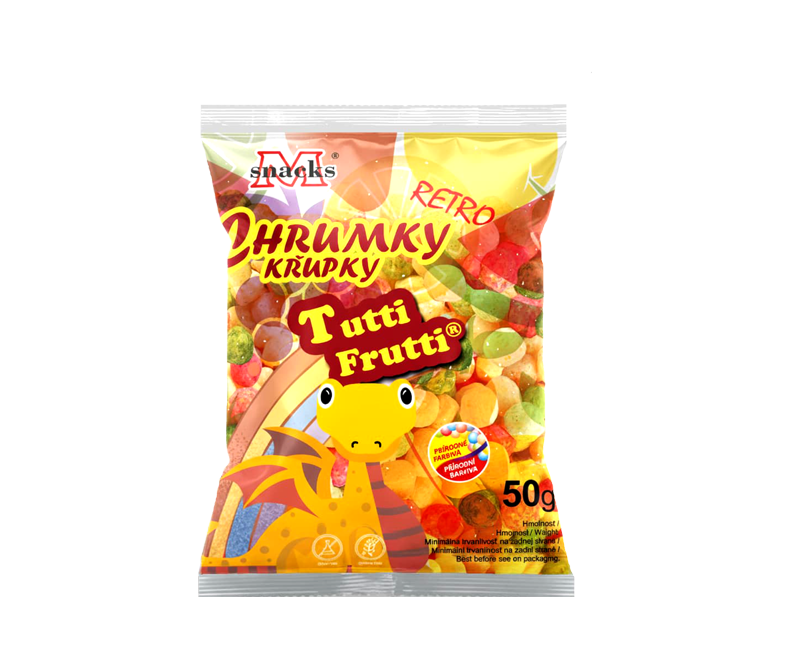 Extrudovaná kukuričná krupica 75%, práškový cukor (cukor, zemiakový škrob), rastlinný olej, aróma TUTTI FRUTTI, aróma (jahoda).